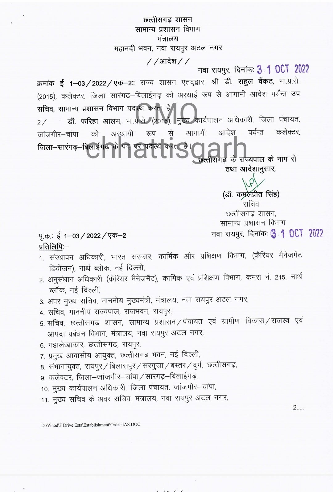 जारी आदेश के अनुसार सरकार सरंगगढ़-बिलाईगढ़ कलेक्टर डी. राहुल वेंकट को उप सचिव सामान्य प्रशासन विभाग की जिम्मेदारी दी गई है। वहीं, डॉ फरिहा आलम को सरंगगढ़-बिलाईगढ़ कलेक्टर बनाया गया है।