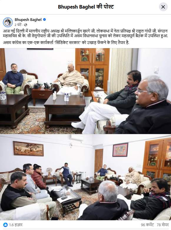 बैठक की तस्वीरें साझा करते हुए भूपेश बघेल ने लिखा कि असम कांग्रेस का एक-एक कार्यकर्ता सिंडिकेट सरकार को उखाड़ फेंकने के लिए पूरी तरह तैयार है। कांग्रेस नेतृत्व की इस बैठक को असम विधानसभा चुनाव के लिहाज से बेहद महत्वपूर्ण माना जा रहा है।