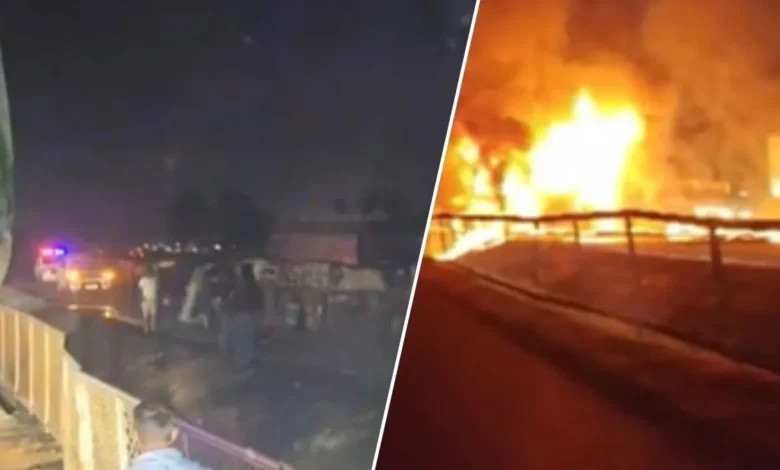 बताया जा रहा है कि विपरीत दिशा से आ रहे ट्रक ने डिवाइडर पार कर बस को टक्कर मार दी। टक्कर इतनी भीषण थी कि बस में तुरंत आग लग गई और दूर तक धमाके जैसी आवाज सुनाई दी।