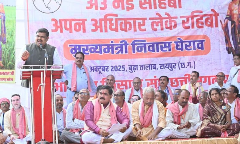 छत्तीसगढ़ में भारतीय किसान संघ का धरना, शिक्षा मंत्री गजेंद्र यादव ने की किसानों से मुलाकात