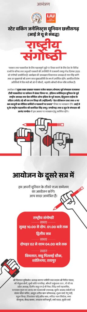 आयोजकों ने प्रदेश के महाविद्यालयों और विश्वविद्यालयों के मीडिया विभागों से आग्रह किया है कि पत्रकारिता के विद्यार्थी इस ज्ञानवर्धक संगोष्ठी में शामिल होकर आधुनिक मीडिया, श्रम कानून और डिजिटल सुरक्षा से जुड़े बदलते स्वरूप को समझने का लाभ लें।