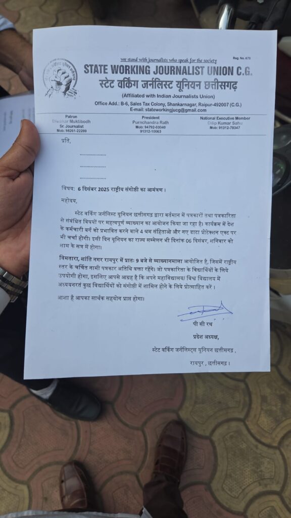 रायपुर। स्टेट वर्किंग जर्नलिस्ट यूनियन छत्तीसगढ़ द्वारा पत्रकारिता और पत्रकारों से जुड़े समसामयिक मुद्दों पर एक महत्वपूर्ण व्याख्यानमाला का आयोजन 6 दिसंबर को किया जा रहा है। कार्यक्रम में देशभर के कर्मचारी वर्ग को प्रभावित करने वाली चार नई श्रम संहिताओं और डाटा प्रोटेक्शन एक्ट पर विशेषज्ञ वक्ता विस्तृत जानकारी देंगे।
