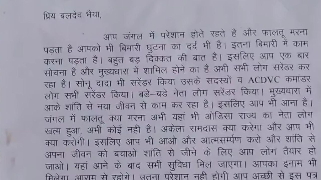 “प्रिय बलदेव भैया, आप जंगल में परेशान रहते हैं, बीमार हैं और हर दिन मौत का डर झेलते हैं। अब सोचिए, सब लोग सरेंडर कर चुके हैं। सोनू दादा, उसके सदस्य और एसीडीवीसी कमांडर तक मुख्यधारा में लौट आए हैं। आप भी आइए, सरकार सभी सुविधाएं दे रही है। इनाम भी मिलेगा और जीवन फिर से शुरू करने का मौका भी।”