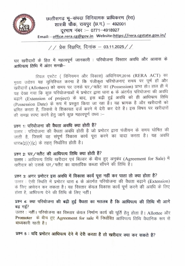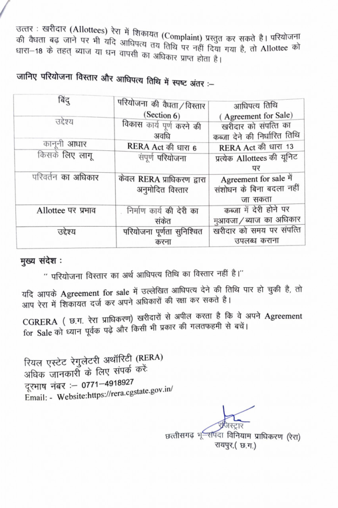 Chhattisgarh RERA Update : RERA ने दी अहम जानकारी – परियोजना विस्तार का मतलब आधिपत्य तिथि बढ़ना नहीं