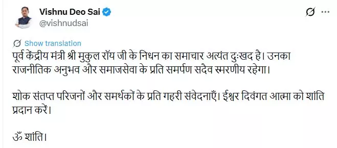 मुख्यमंत्री साय ने मुकुल रॉय के निधन पर जताया शोक