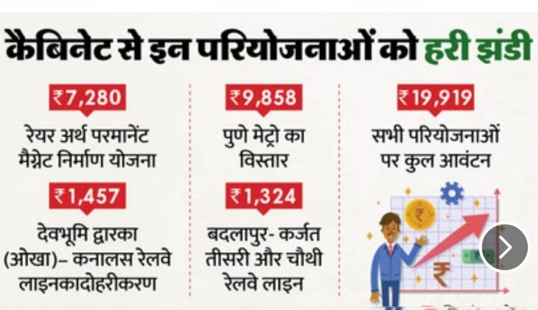 नई दिल्ली। केंद्र सरकार ने बुधवार को बुनियादी ढांचे, औद्योगिक विस्तार और रणनीतिक उत्पादन क्षमता बढ़ाने के उद्देश्य से कुल 19,919 करोड़ रुपये की चार महत्वपूर्ण परियोजनाओं को स्वीकृति प्रदान की। इसमें 7,280 करोड़ रुपये की दुर्लभ पृथ्वी स्थायी मैग्नेट निर्माण योजना शामिल है, जिसे इलेक्ट्रिक वाहन, नवीकरणीय ऊर्जा और रक्षा क्षेत्र के लिए अहम माना जा रहा है। इसके अलावा पुणे मेट्रो विस्तार के लिए 9,858 करोड़ रुपये, देवभूमि द्वारका (ओखा)-कनालस रेलवे लाइन दोहरीकरण हेतु 1,457 करोड़ रुपये और बदलापुर-कर्जत तीसरी व चौथी रेलवे लाइन के लिए 1,324 करोड़ रुपये स्वीकृत किए गए हैं।