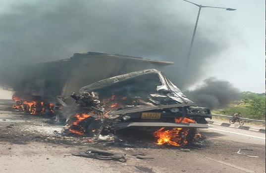 समलपुरी ब्रिज पर भीषण हादसा: तेज रफ्तार ट्राला टकराया, आग में जिंदा जला चालक