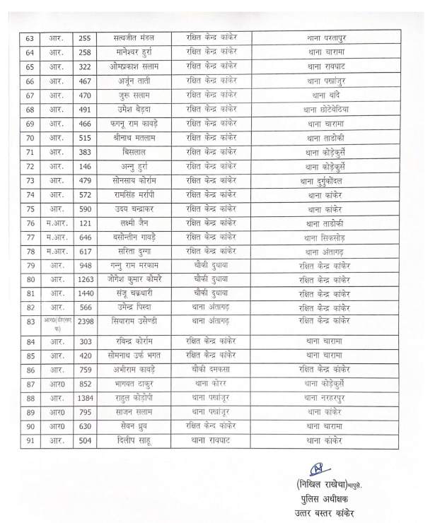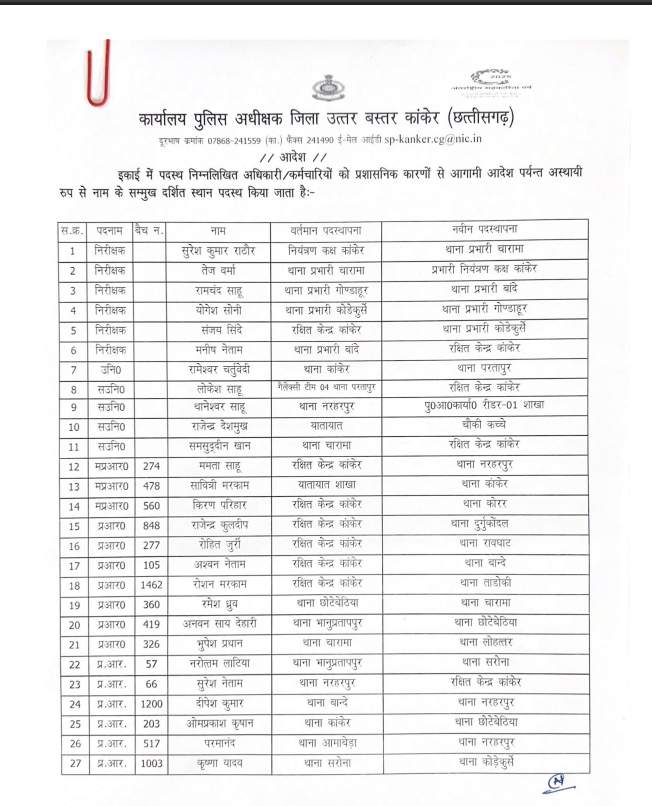 कांकेर : नए एसपी के पदभार ग्रहण के बाद पुलिस में बड़ा फेरबदल, 91 कर्मचारियों का तबादला