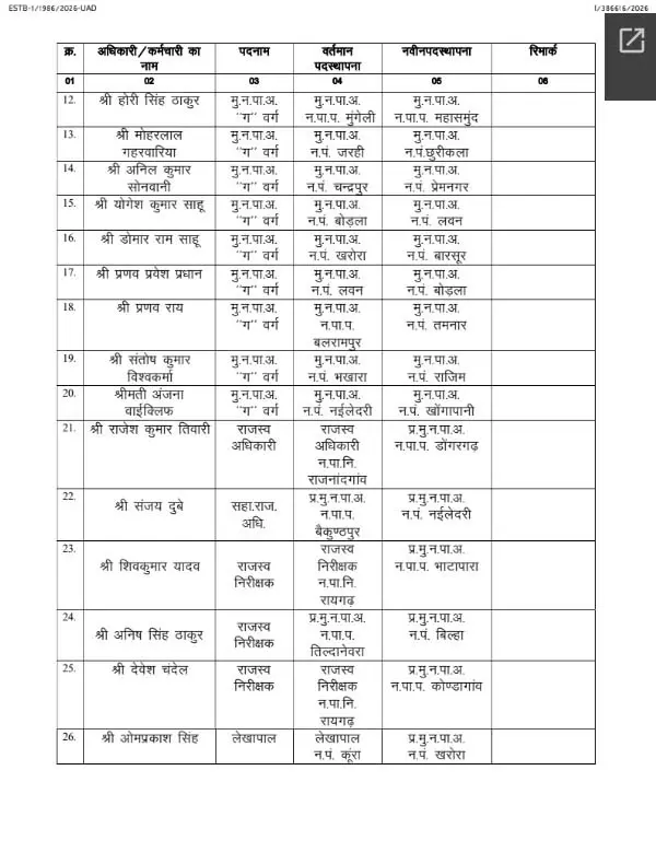 रायपुर। छत्तीसगढ़ शासन के नगरीय प्रशासन एवं विकास विभाग ने प्रशासनिक कसावट लाते हुए बड़े पैमाने पर तबादला आदेश जारी किया है। विभाग द्वारा जारी नवीनतम सूची में कई निकायों के मुख्य नगरपालिका अधिकारियों (CMO), लेखपालों और निरीक्षकों के प्रभार बदले गए हैं।