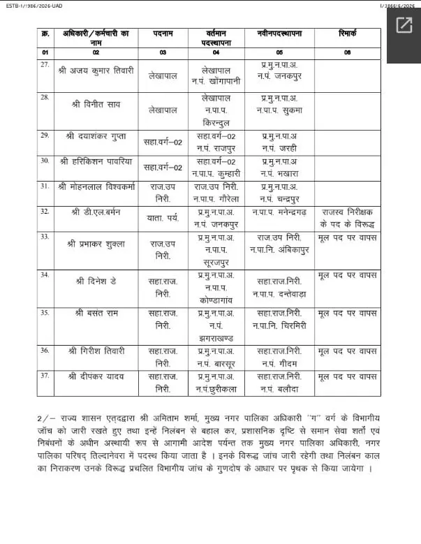 नगरीय प्रशासन विभाग में बड़ी प्रशासनिक सर्जरी: सीएमओ समेत कई अधिकारी बदले गए