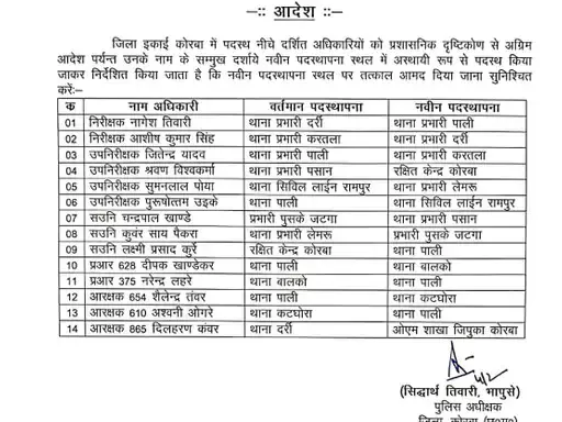कोरबा में पुलिस विभाग में बड़ा फेरबदल, कई थाना प्रभारियों सहित 14 पुलिसकर्मियों का तबादला