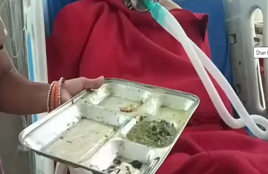 राम प्रसाद की पत्नी ने बताया कि शनिवार दोपहर अस्पताल कर्मी द्वारा दिया गया भोजन खाते समय अचानक उनके पति का गला अटक गया और सांस लेने में परेशानी होने लगी। जब उन्होंने तुरंत खाना बाहर निकाला तो उसमें लंबे बाल और लकड़ी का तिनका मिला।