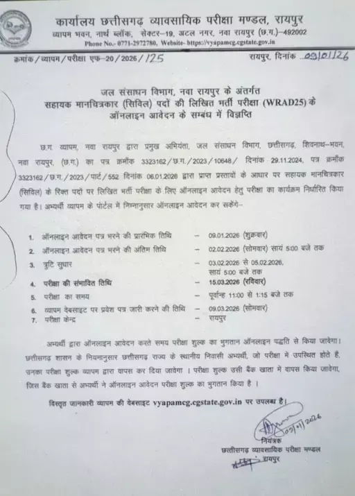 रायपुर: व्यापम ने जारी किया जल संसाधन विभाग में सहायक मानचित्रकार (सिविल) भर्ती का नोटिफिकेशन, 9 जनवरी से शुरू होगी ऑनलाइन आवेदन प्रक्रिया