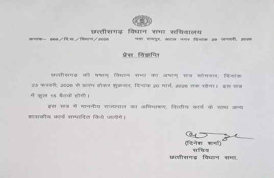 रायपुर। छत्तीसगढ़ विधानसभा के बजट सत्र की तिथियों की घोषणा कर दी गई है। विधानसभा सचिवालय द्वारा जारी अधिसूचना के अनुसार, यह महत्वपूर्ण सत्र 23 फरवरी से शुरू होकर 20 मार्च तक चलेगा। लगभग एक महीने तक चलने वाले इस सत्र में कुल 15 बैठकें आयोजित की जाएंगी।