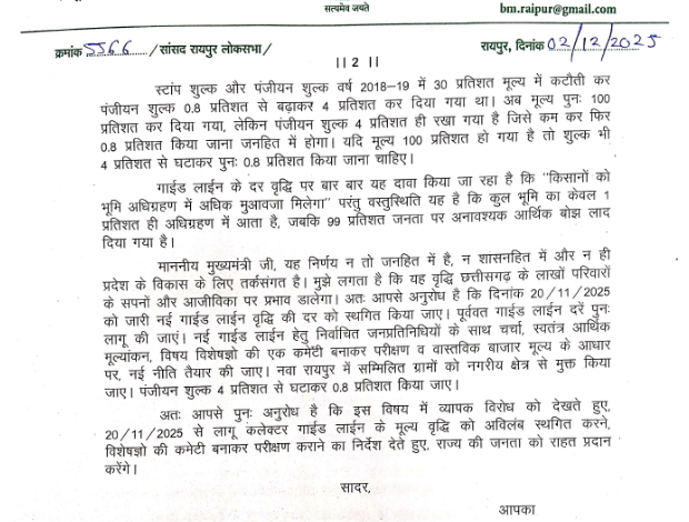 रायपुर। छत्तीसगढ़ में भूमि खरीदी-बिक्री के लिए कलेक्टर गाइडलाइन दरों में 100 प्रतिशत से 800 प्रतिशत तक की बढ़ोतरी के खिलाफ राजनीतिक स्तर पर विरोध तेज हो गया है। रायपुर लोकसभा सांसद और वरिष्ठ भाजपा नेता बृजमोहन अग्रवाल ने इस वृद्धि को जनविरोधी और अव्यावहारिक बताते हुए मुख्यमंत्री विष्णुदेव साय को पत्र लिखकर निर्णय को तत्काल स्थगित करने की मांग की है।